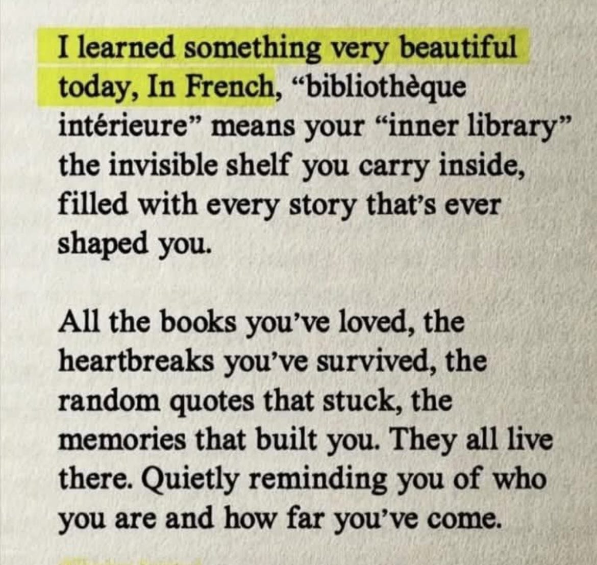 I love the idea of an internal library. It is so true. Like you, I have a whole number of different sections and books standing around.
